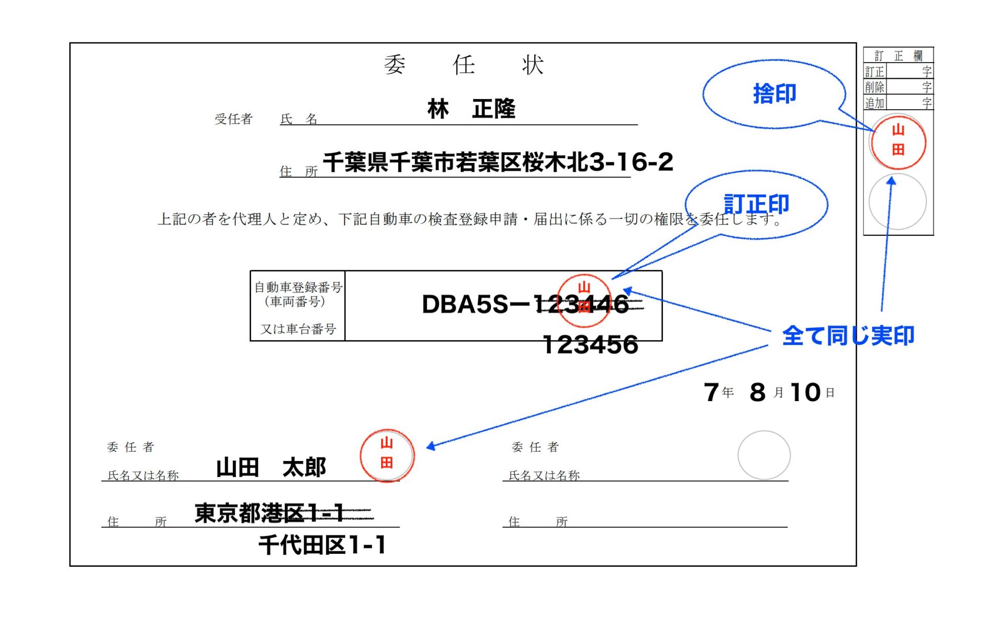 訂正印とは、間違えた箇所に直接実印を押して訂正する方法です。訂正印を押せば全ての箇所の訂正が可能ですので、間違えた場合の最強の訂正方法といえます。しかし、委任状や譲渡証明書などは受任者(代理人)が記載することも多いので、代理人が書類作成時に記入を間違えてしまうと、再度書類を委任者に戻して訂正印を押してもらう手間がかかります。