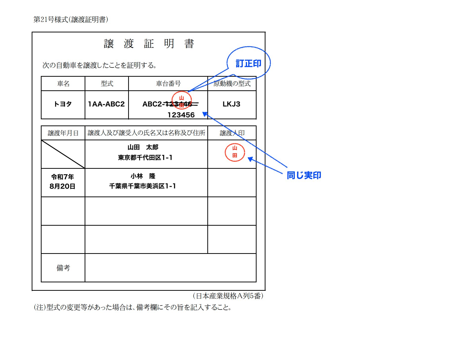 譲渡証明書は譲渡人が作成する書類ですので、譲渡人の実印で訂正を行います。譲渡証明書は、基本的に捨印での訂正はできません。